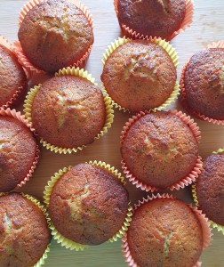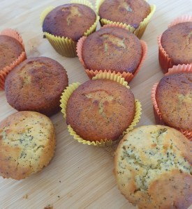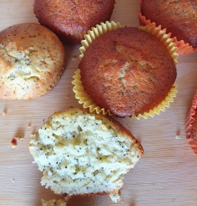 Σε ένα μεγάλο μπολ ανακατεύουμε την ζάχαρη με το λιωμένο βούτυρο. Προσθέτουμε τα αυγά και ανακατεύουμε καλά. Σειρά έχουν το γάλα, ο χυμός λεμονιού, το ξύσμα λεμονιού, η βανίλια και η μαγειρική σόδα. Στο τέλος προσθέτουμε το αλεύρι και ανακατεύουμε. Γεμίζουμε τα 3/4 των θηκών μας. Ψήνουμε στους 1800 στον αέρα για περίπου 25 λεπτά μέχρι να ροδοκοκκινίσουν.